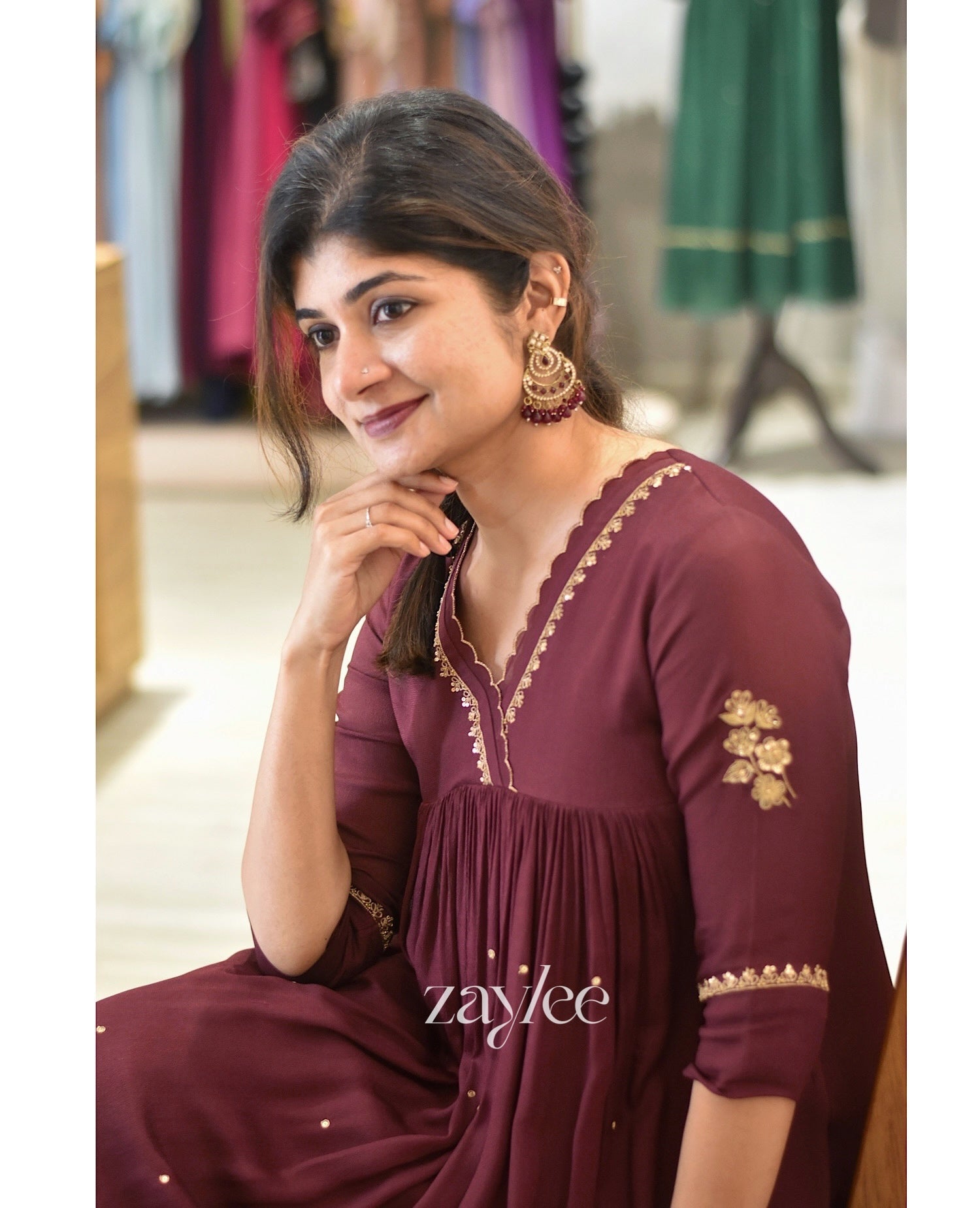 Deep Brown Gathered Kurta with Scalloped Neckline