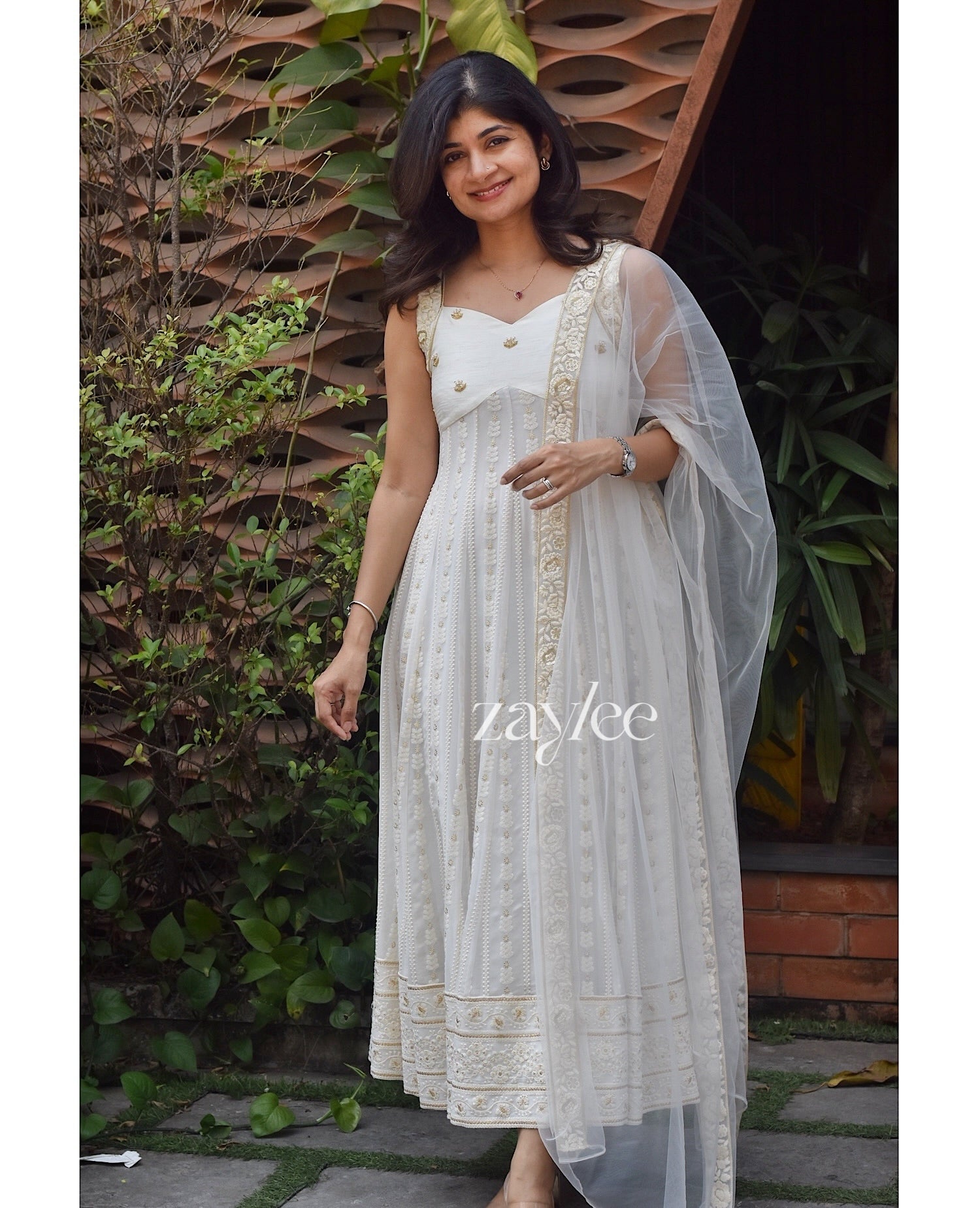 Off White Chikankari Panel Anarkali & Net dupatta